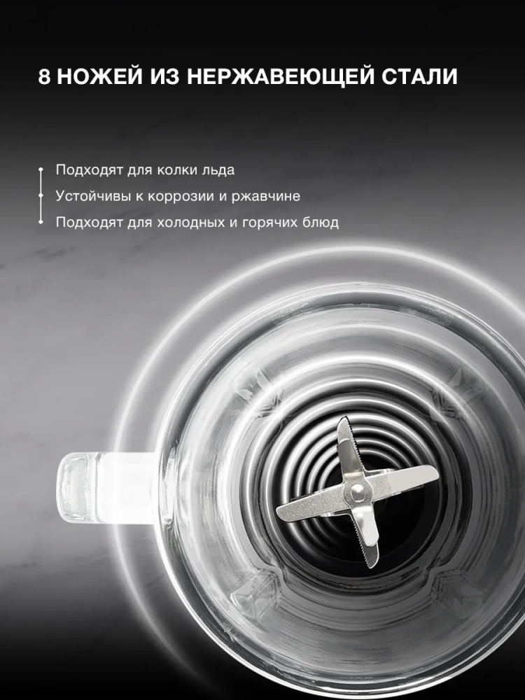 Благодаря мощности 1500 Вт и скорости вращения до 28 000 оборотов в минуту, прибор с лёгкостью справляется с самыми разными задачами: от измельчения мягких фруктов до колки льда и приготовления супов-пюре. Блендер оснащен 8 ножами из нержавеющей стали, устойчивым к ржавчине и коррозии. Лезвия легко перерабатывают как холодные, так и горячие ингредиенты, что делает модель универсальной для приготовления смузи, коктейлей, соусов и крем-супов.
