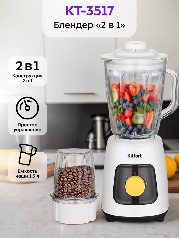 Блендер Kitfort КТ-3517 (2 в 1) выполняет функции не только блендера, но и кофемолки.