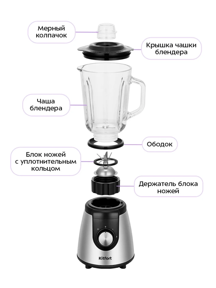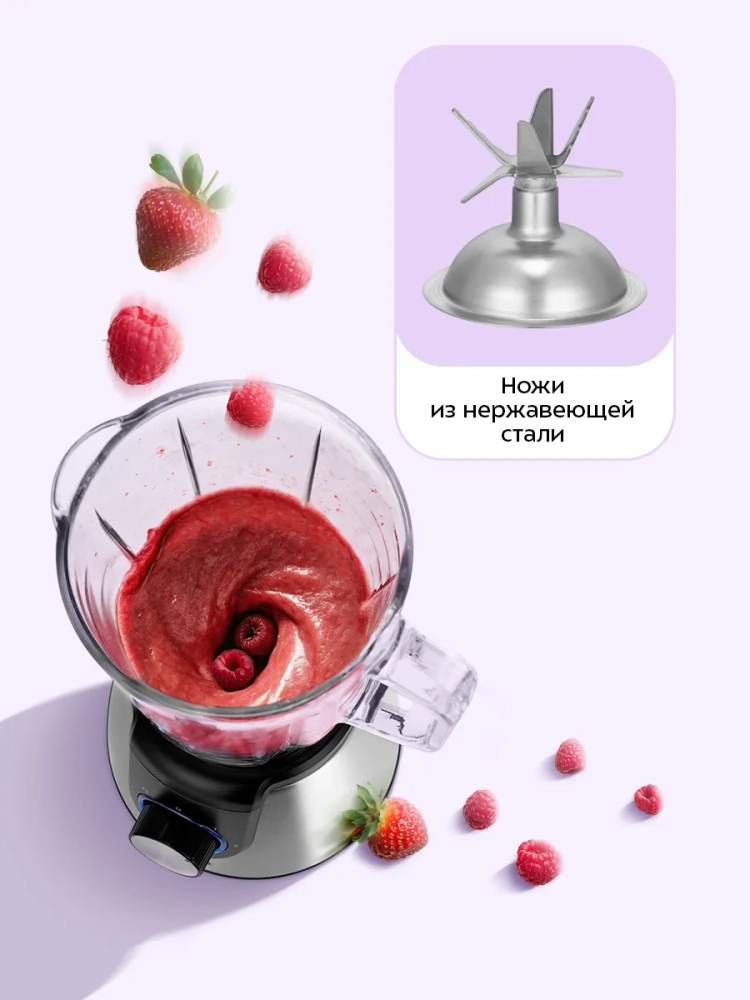 Блендер оснащен надежным двигателем мощностью 1000 Вт и ножами из нержавеющей стали, что обеспечивает долгий срок службы.