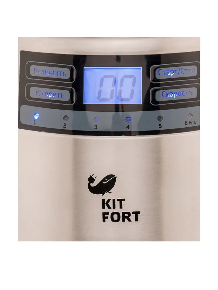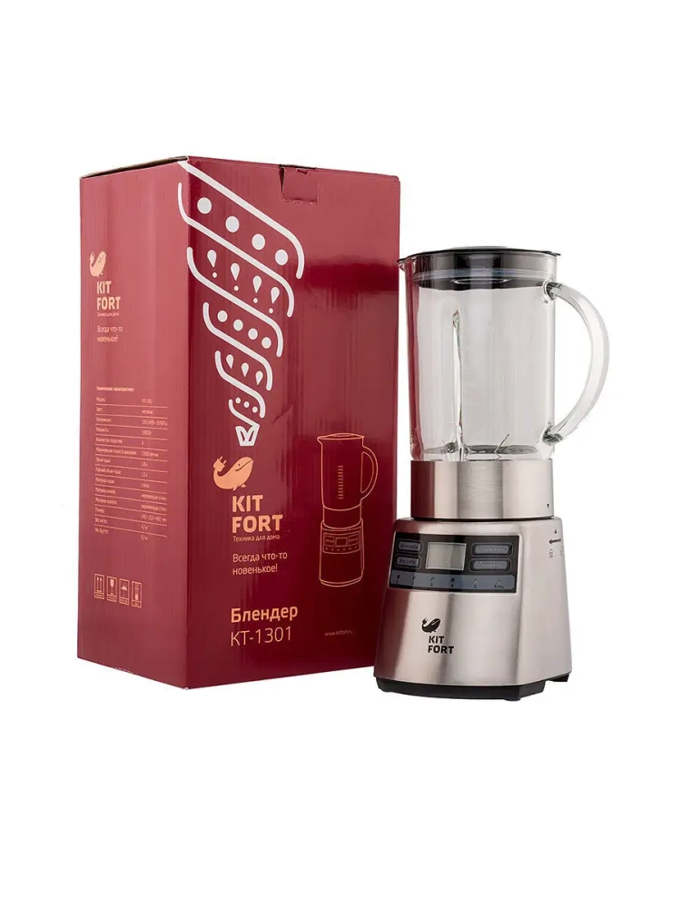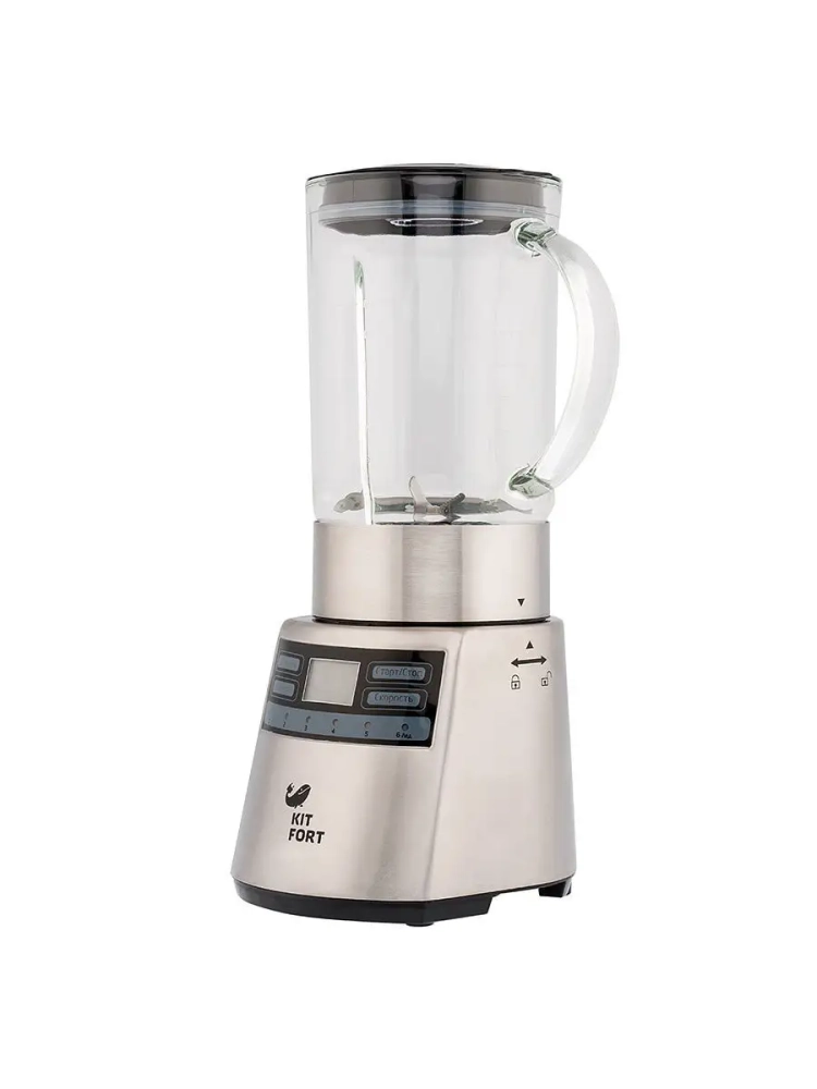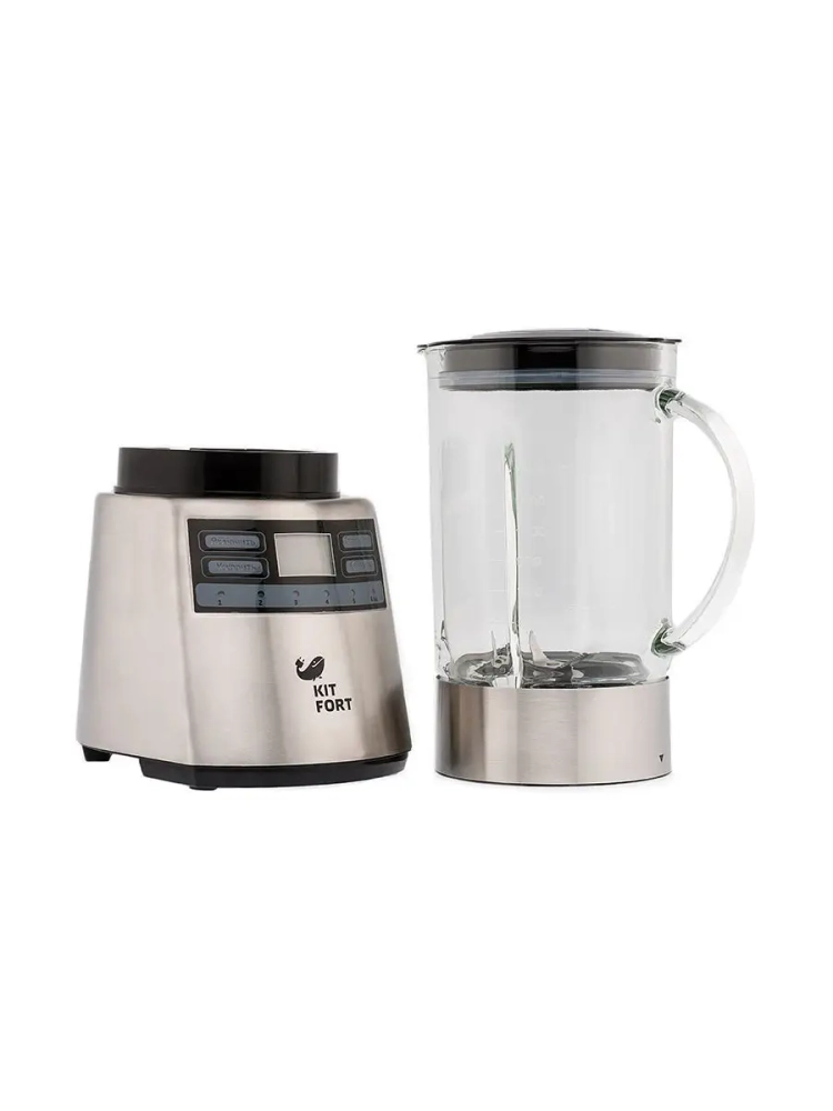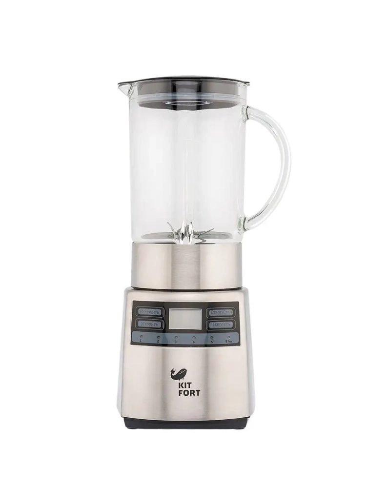 Блендер Китфорт оснащен вместительной стеклянной чашей с мерной шкалой объемом 1,8 литра, в крышке которой есть отверстие, закрываемое колпачком, для добавления ингредиентов непосредственно во время работы. Колпачок отверстия для пополнения может использоваться как мерный стакан. Удобное и понятное управление прибором состоит из 6-ступенчатого электронного переключателя скорости и кнопки включения ускоренного режима. На цифровом LCD дисплее с подсветкой отображается время работы (таймер).