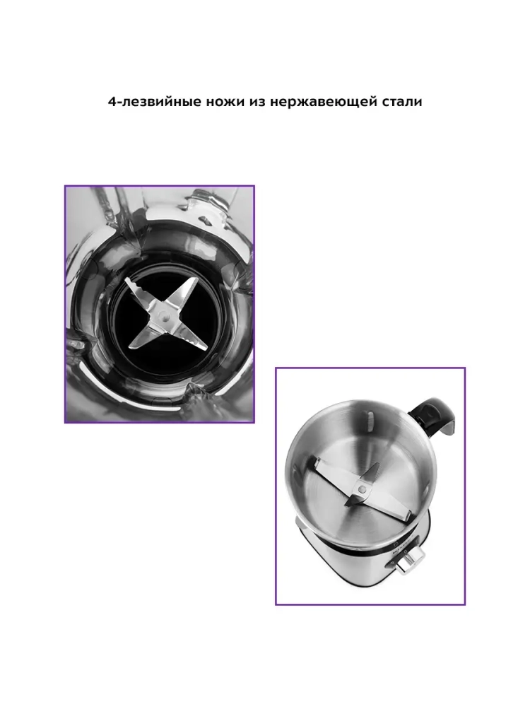 Мини-блендер в комплекте с основной чашей позволяет готовить небольшие порции смузи или пюре, что особенно удобно для детского питания. Набор насадок включает в себя различные варианты для измельчения и смешивания, что расширяет функциональность прибора. Моторный блок обеспечивает стабильную работу блендера, а металлический корпус гарантирует долговечность и устойчивость к износу.