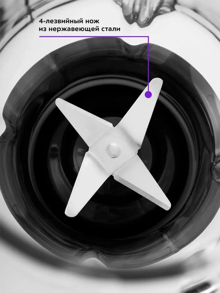 Для обеспечения безопасности блендер может работать только с установленной чашей. Резиновые ножки обеспечивают фиксацию на столе.