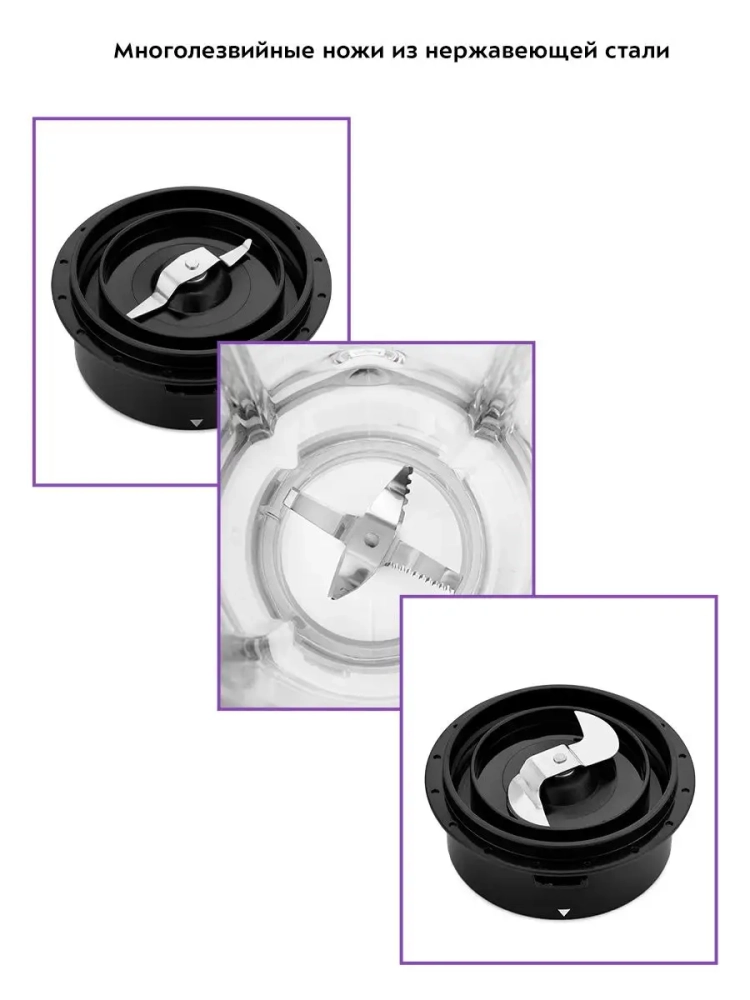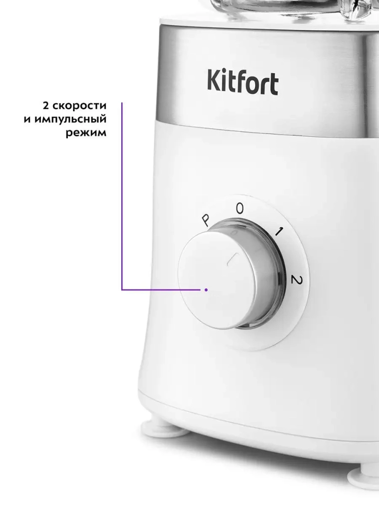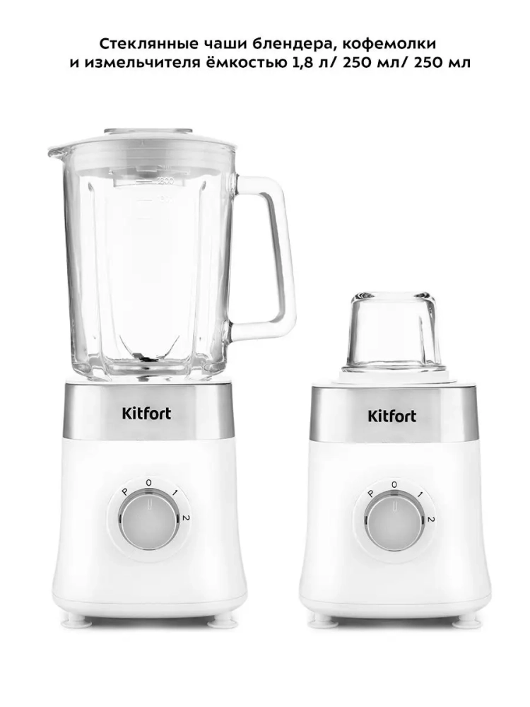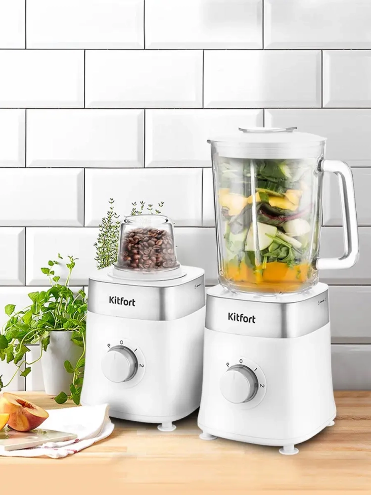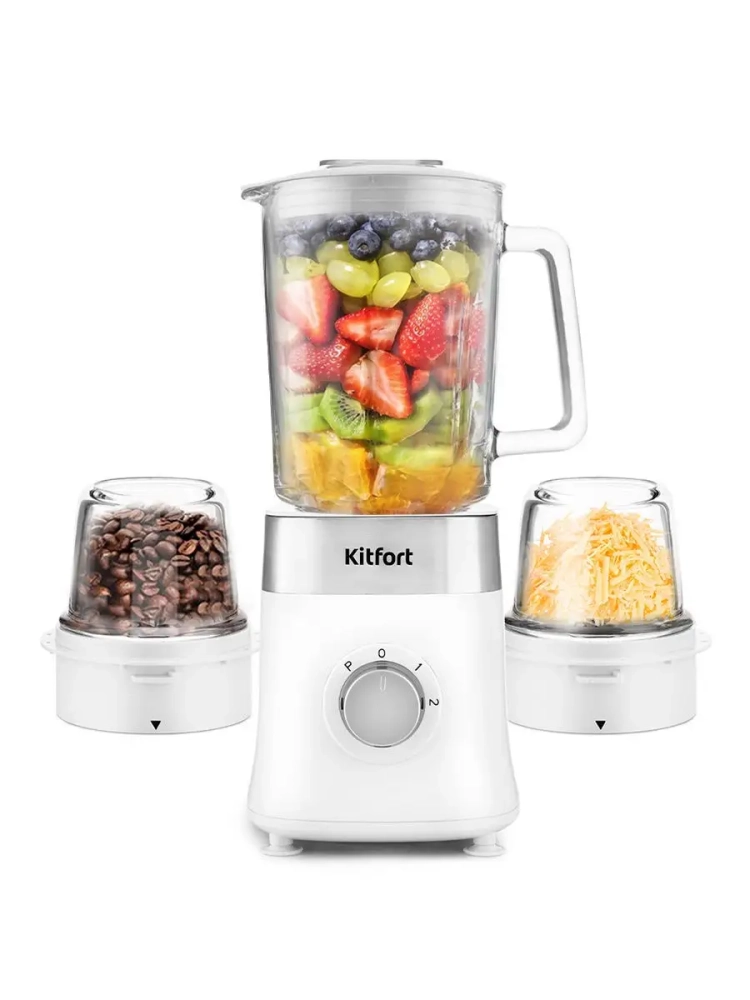 Блендер 3 в 1 Kitfort КТ-3030 выполняет функции не только блендера, но также измельчителя и кофемолки. Блендер оснащен регулятором скорости, который позволяет переключать скорость работы. Измельчитель позволит быстро измельчить мягкие продукты, такие как мясо, сыр, перец, травы, ягоды и многое другое. Кофемолка с легкостью справится с кофейными зернами, специями и орехами. Чаши кофемолки и измельчителя выполнены из стекла, что очень удобно для контроля над процессом измельчения. Блендер оснащен вместительной стеклянной чашей емкостью 1,8 л с мерной шкалой. В крышке чаши есть специальное отверстие, закрываемое колпачком, для добавления ингредиентов непосредственно во время работы. Колпачок может использоваться как мерный стакан. Емкость мерного колпачка - 100 мл. Управление блендером осуществляется при помощи регулятора скорости. Переключение скоростей позволяет выбрать оптимальный способ смешивания различных ингредиентов.