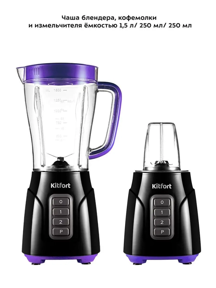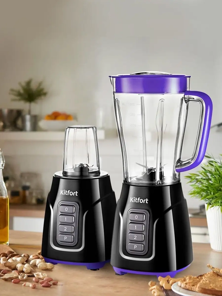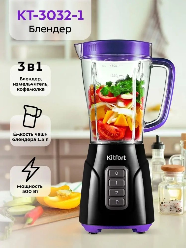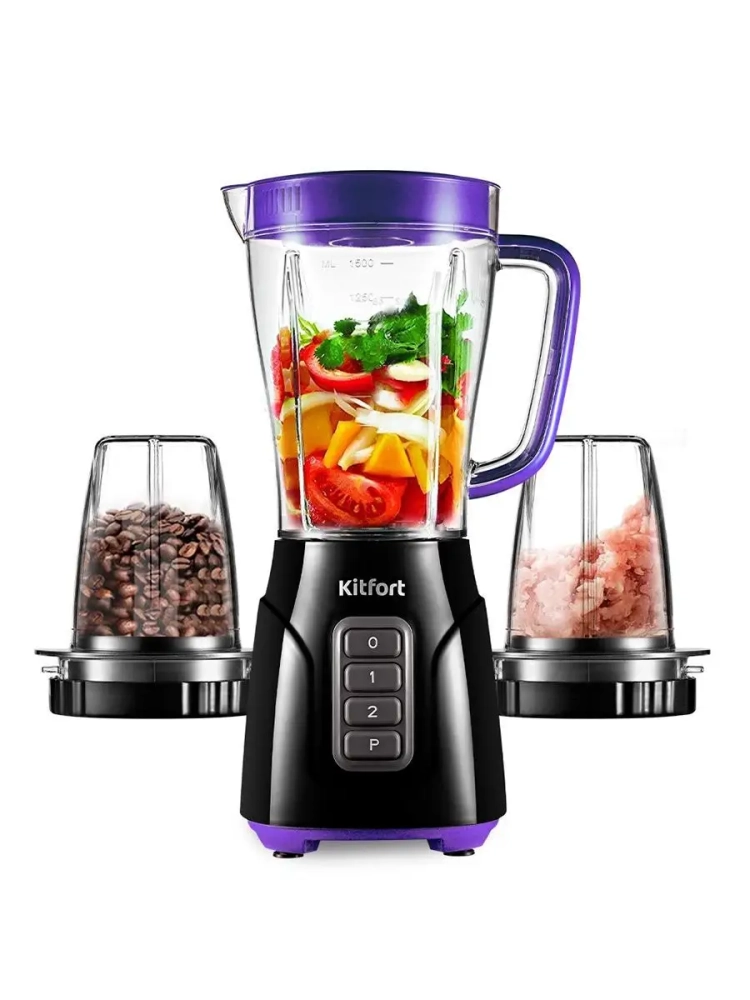 Блендер 3 в 1 Kitfort КТ-3032 выполняет функции не только блендера, но также измельчителя и кофемолки. Измельчитель позволит быстро измельчить мягкие продукты, такие как мясо, твердый сыр, помидоры, огурцы, перец, травы, ягоды и многое другое. Кофемолка с легкостью справится с кофейными зернами, специями и орехами. Чаши кофемолки и измельчителя выполнены из прозрачного пластика, что очень удобно для контроля над процессом измельчения. Блендер оснащен вместительной пластиковой чашей емкостью 1,5 л с мерной шкалой. В крышке чаши есть специальное отверстие, закрываемое колпачком, для добавления ингредиентов непосредственно во время работы. Колпачок может использоваться как мерный стакан. Емкость мерного колпачка - 50 мл. Стационарный блендер очень удобен в использовании. В отличие от погружного блендера он исключает возможность брызг при работе, поскольку смешивание происходит в емкости с закрытой крышкой.