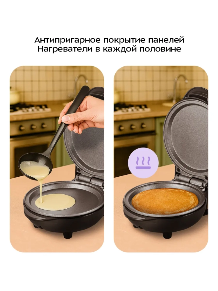 Антипригарное покрытие не дает прилипнуть тесту в процессе приготовления и позволяет готовить с минимальным количеством масла. Также антипригарное покрытие облегчает чистку панелей.