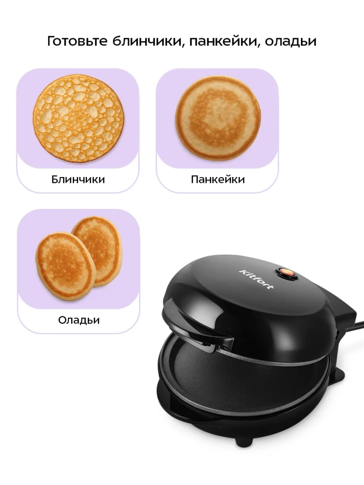 С помощью электрической блинницы Kitfort КТ-4628 вы сможете печь небольшие блинчики. Прибор рассчитан на приготовление одного блинчика за раз. С КТ-4628 вы сможете делать красивые десерты, подавая блинчики с мороженным, шоколадной пастой, джемом и фруктами.