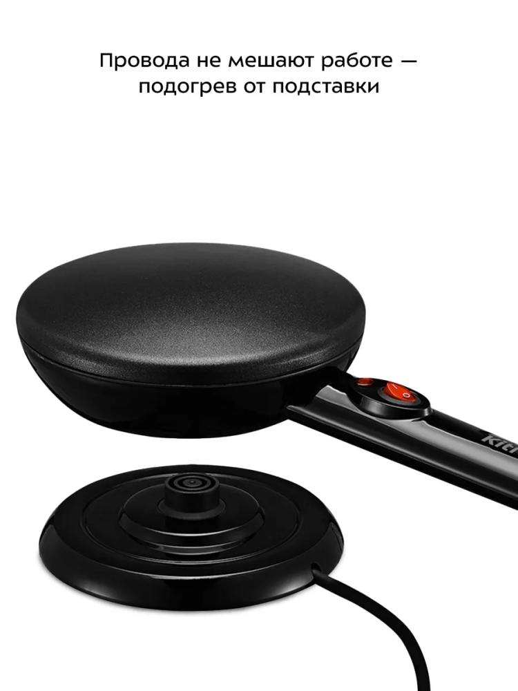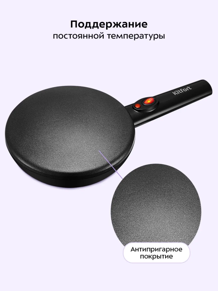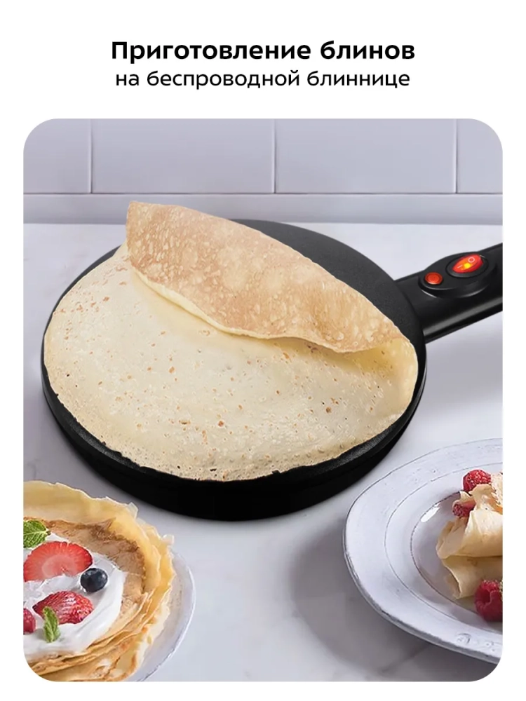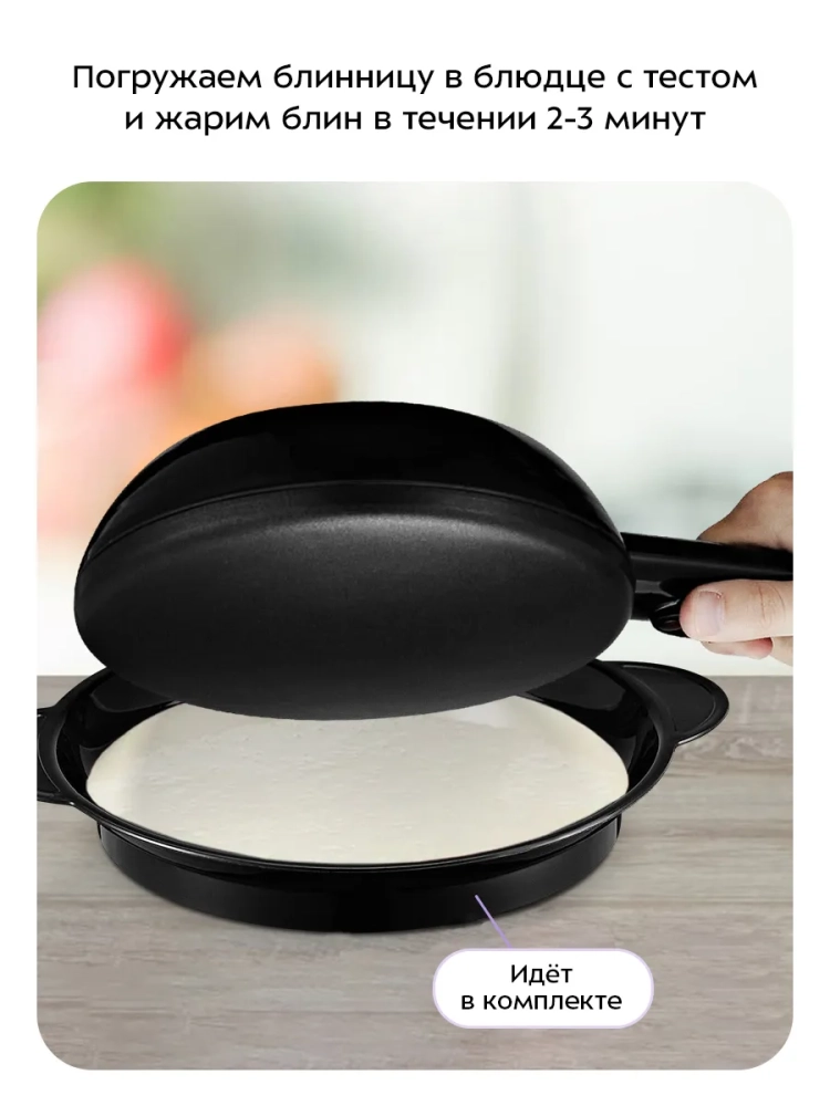 С помощью беспроводной погружной блинницы Kitfort КТ-1677 можно испечь блины быстро и без лишних усилий. При использовании обычной сковороды или блинницы тесто наливается на них, а затем разравнивается по всей поверхности. При этом достаточно сложно получить тонкие ровные блины. Принцип нанесения теста на погружную блинницу совершенно иной: рабочая поверхность блинницы погружается в тесто на несколько секунд, а затем ставится на подставку для дальнейшей жарки. При погружении блинницы на нее налипает тонкий равномерный слой теста, так что блин получается с ровными краями и равномерной толщины. Благодаря антипригарному покрытию готовить можно с минимальным количеством масла: масло добавляется в тесто, поэтому при выпечке оно не разбрызгивается в разные стороны. Блинница оснащена термостатом для поддержания постоянной температуры поверхности. Корпус блинницы выполнен из термоустойчивого пластика. В комплекте идет специальное блюдце для теста, куда погружается блинница. Преимущества беспроводной погружной блинницы: - ее не нужно ставить на плиту, поэтому можно печь блины на любой удобной ровной твердой поверхности, устойчивой к высоким температурам;- мобильность движений из-за отсутствия шнура питания на корпусе устройства;- благодаря простоте процесса этот тип блинницы отлично подойдет для новичков в выпекании блинов.