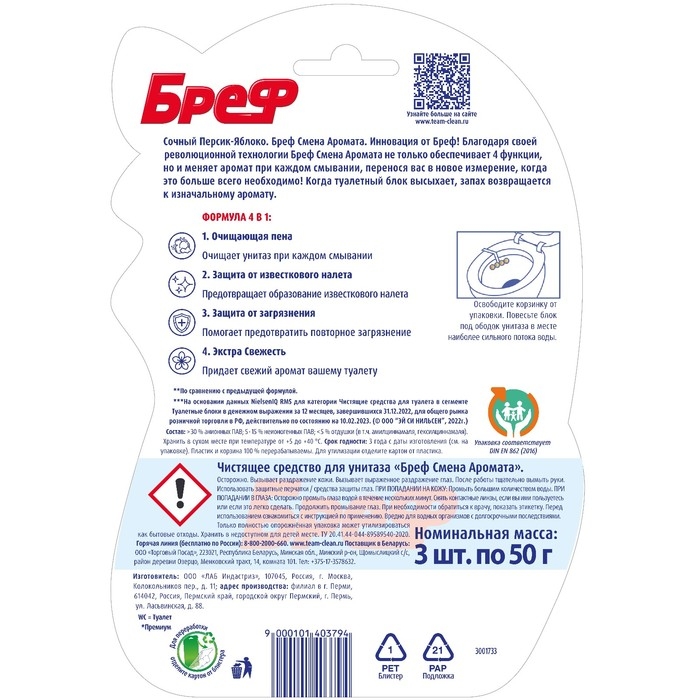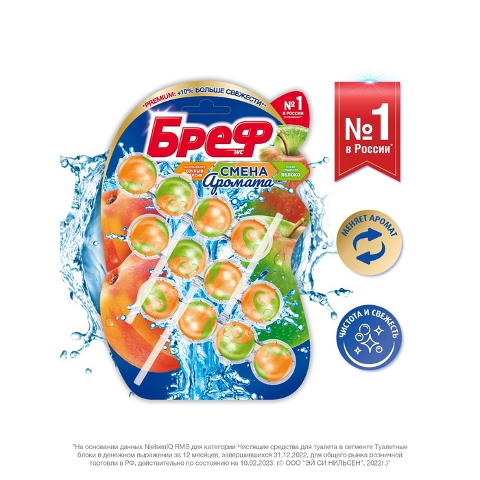 Бреф Смена Аромата – это подвесной туалетный блок с технологией смены ароматов, которая наполняет комнату ароматом сочного персика, меняющимся при смывании на аромат цветущей яблони!