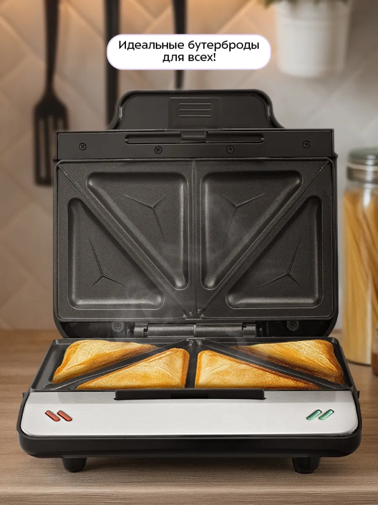 Электрическая бутербродница Kitfort KT-4611 поможет приготовить самые разнообразные бутерброды. В бутерброднице можно готовить не только привычные бутерброды с ветчиной и сыром, но и сладкие бутерброды, например, с яблоками и творогом, пирожки из слоеного теста с разнообразными начинками, драники и многое другое. Бутербродница KT-4611 рассчитана на 2 порции бутербродов из хлеба для тостов.