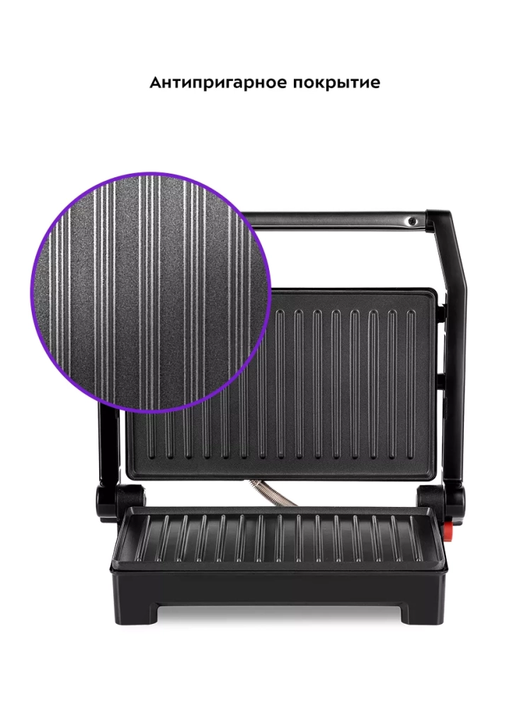 Бутербродница оснащена термостатом для поддержания температуры панелей, а также индикаторами работы и нагрева. Противоскользящие ножки не дают прибору скользить по столу во время готовки.