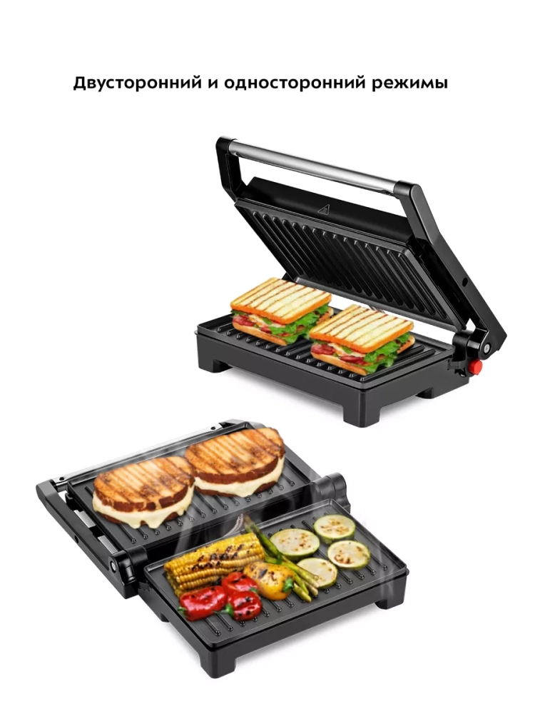 Конструкция бутербродницы позволяет готовить в двух режимах: двустороннем и одностороннем. В двустороннем режиме бутербродница закрывается крышкой, так что продукты находятся между двух нагреваемых панелей и готовятся с двух сторон сразу. Такой способ позволяет сократить время готовки, а также не требует переворачивания продуктов во время приготовления. В одностороннем режиме крышка бутербродницы откидывается на 180°, благодаря чему продукты можно выложить сразу на две панели. Данная модель не оснащена сливом для жира и сока, поэтому необходимо следить за тем, чтобы сок не вытекал через бортики панелей.