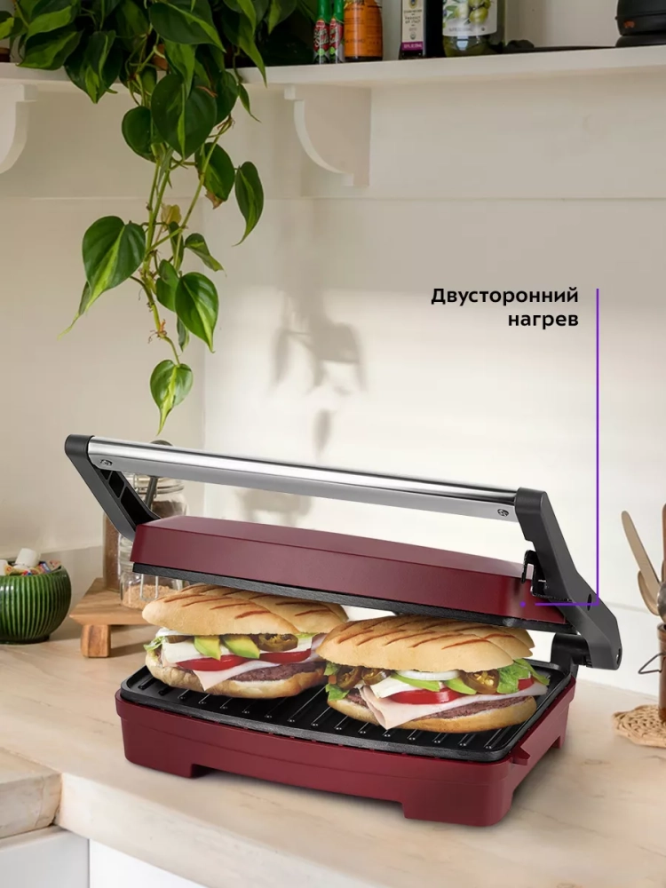 Бутербродница оснащена термостатом для поддержания температуры панелей, а также индикаторами питания и нагрева. Специальный фиксатор сбоку гриля удерживает крышку в закрытом состоянии, что делает готовку, транспортировку и хранение более удобными.