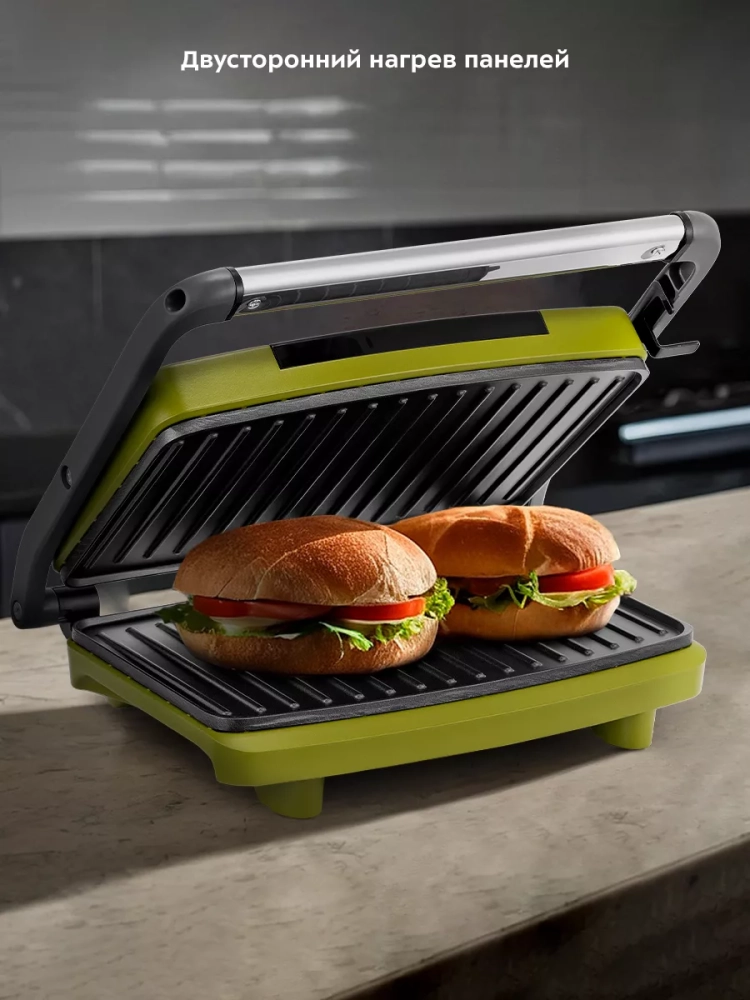 Антипригарное покрытие панелей позволяет готовить с минимальным количеством масла или вовсе без него, что упрощает процесс чистки. Размер панели составляет 23 х 15 см, что достаточно для приготовления нескольких порций одновременно. Бутербродница оснащена термостатом, который поддерживает оптимальную температуру панелей, а специальный фиксатор удерживает крышку в закрытом состоянии, обеспечивая безопасность и удобство при транспортировке и хранении.