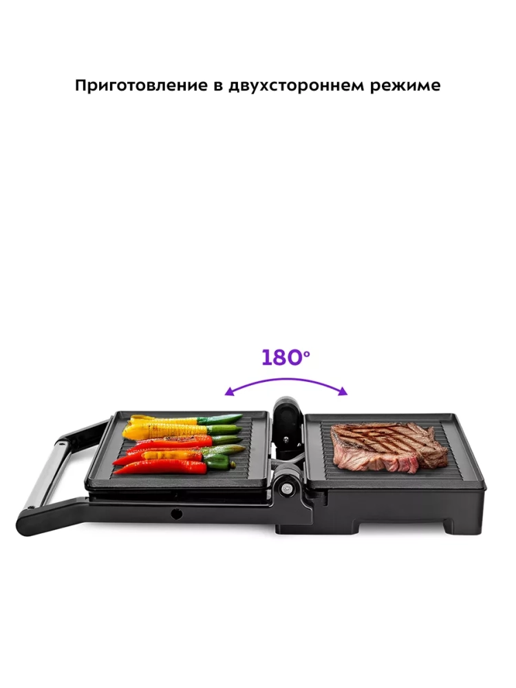 Конструкция бутербродницы позволяет готовить в двух режимах: двустороннем и одностороннем. В двустороннем режиме бутербродница закрывается крышкой, так что продукты находятся между двух нагреваемых панелей и готовятся с двух сторон сразу. Такой способ позволяет сократить время готовки, а также не требует переворачивания продуктов во время приготовления. В одностороннем режиме крышка бутербродницы откидывается на 180°, благодаря чему продукты можно выложить сразу на две панели. Данная модель не оснащена сливом для жира и сока, поэтому необходимо следить за тем, чтобы сок не вытекал через бортики панелей.