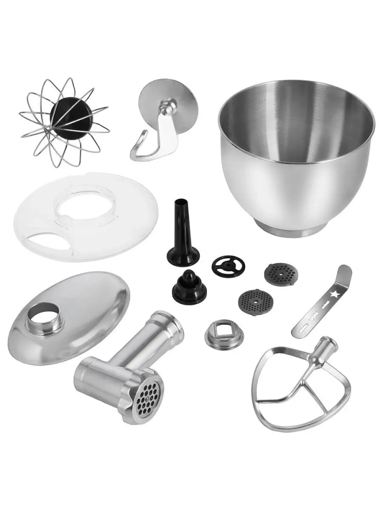 В комплекте к миксеру идут насадки для взбивания, перемешивания и приготовления пюре, а также крюки для замеса тугого теста и защитный кожух от брызг, покрывающий насадки.