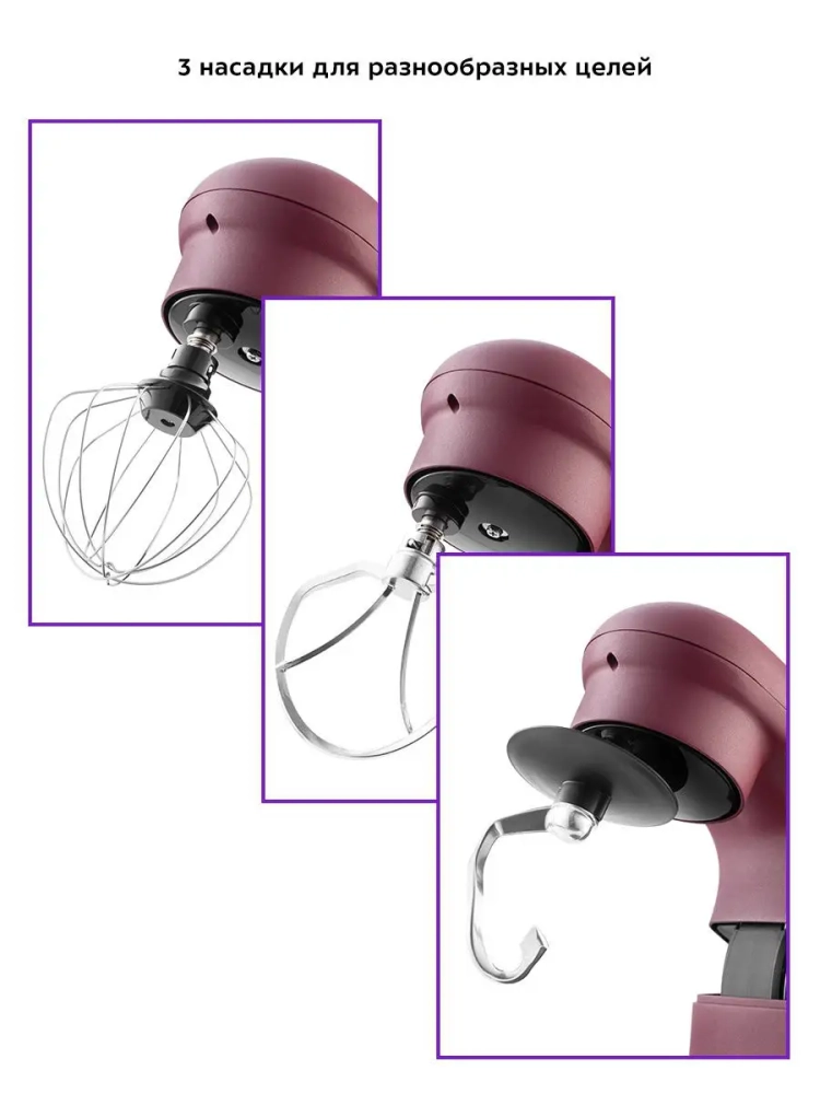 В комплекте идут насадки для взбивания, перемешивания и приготовления пюре, крюк для замеса крутого теста.