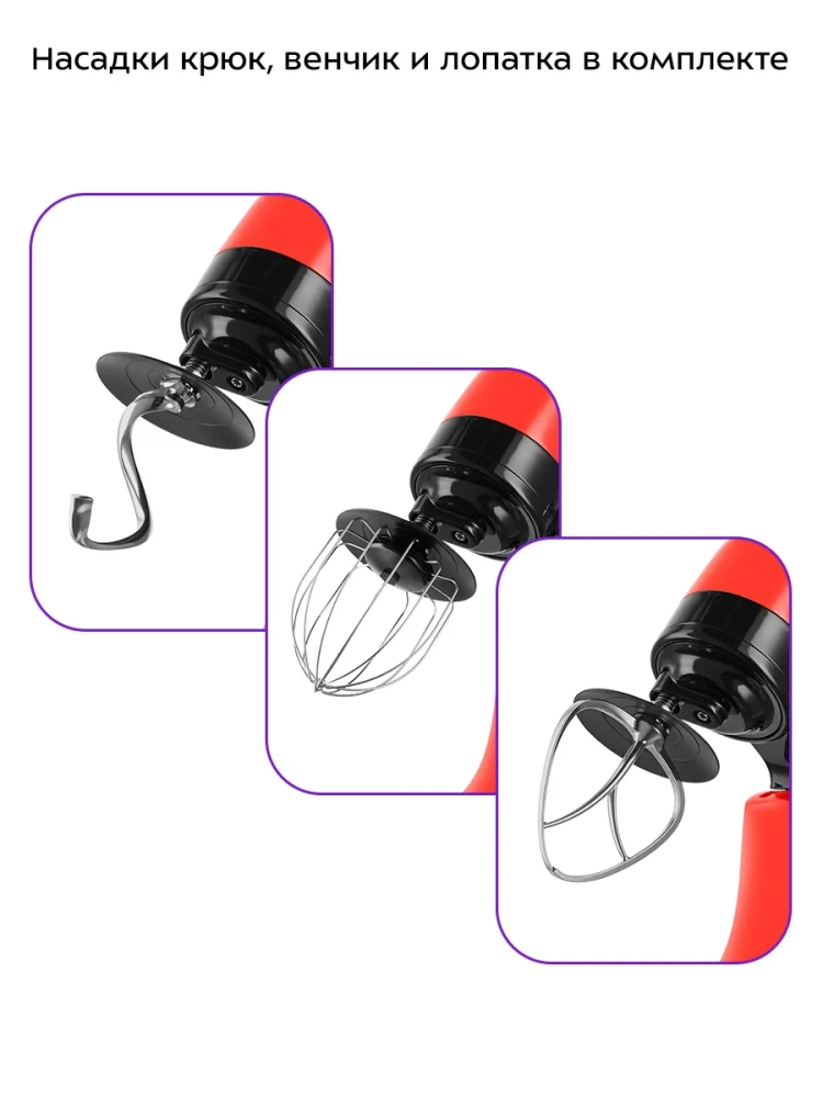 Венчик служит для взбивания яичных белков, сливок, замешивания жидкого теста. Насадка для смешивания используется для негустых ингредиентов, приготовления картофельного пюре, томатной пасты, кондитерских смесей или теста для тортов. Крюк для замешивания подойдет для замешивания густого теста.