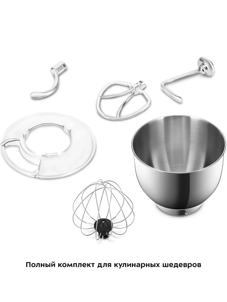 Цельнометаллический планетарный миксер Kitfort КТ-4409 поможет вам смешать ингредиенты, взбить яичный белок или сливки, приготовить картофельное пюре, соус, крем, мусс, замесить жидкое тесто для блинов и крутое — для пельменей и пирогов. В комплекте есть венчик для взбивания, насадка для смешивания и крюки для замешивания.
