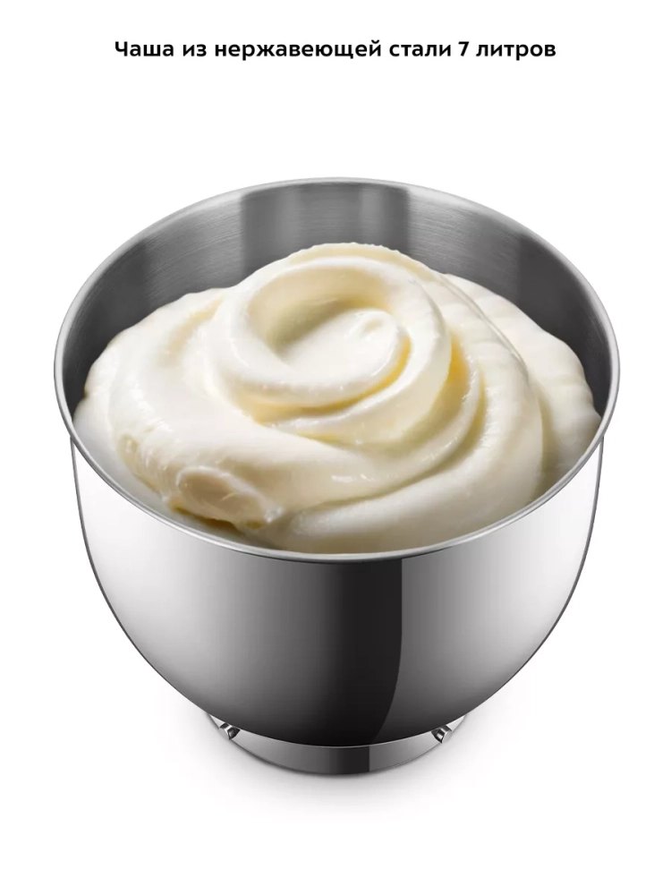 Миксер оснащен большой чашей емкостью 7 литров. Чаша изготовлена из нержавеющей стали, она прочная, и в ней можно смешивать даже горячие ингредиенты.