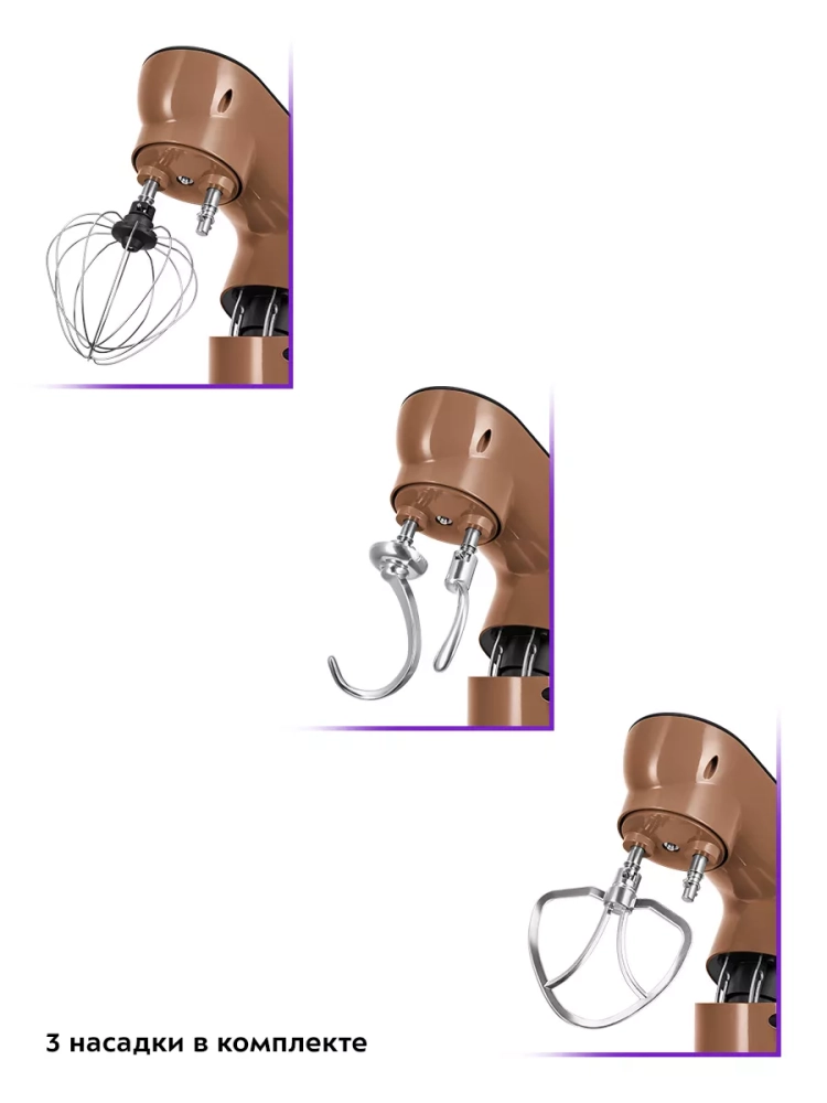Венчик служит для взбивания яичных белков, сливок, замешивания жидкого теста. Насадка для смешивания используется для негустых ингредиентов, приготовления картофельного пюре, томатной пасты, кондитерских смесей или теста для тортов. Крюки для замешивания подойдут для замешивания густого теста.