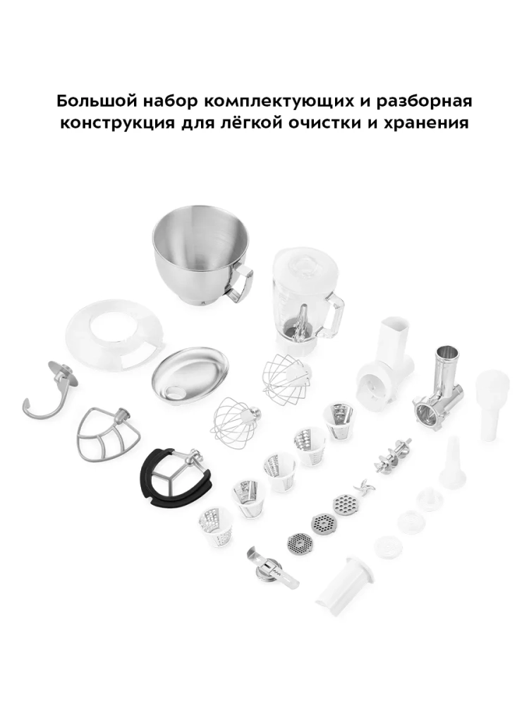 Планетарный механизм вращения обеспечивает равномерное перемешивание ингредиентов, что делает его идеальным для приготовления пиццы и других блюд. Чаша из нержавеющей стали вместительна и прочна, что позволяет готовить большие объемы теста. В комплекте идут различные насадки, которые расширяют функциональность прибора, превращая его в многофункциональный кухонный комбайн.