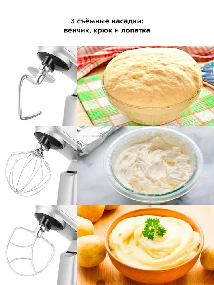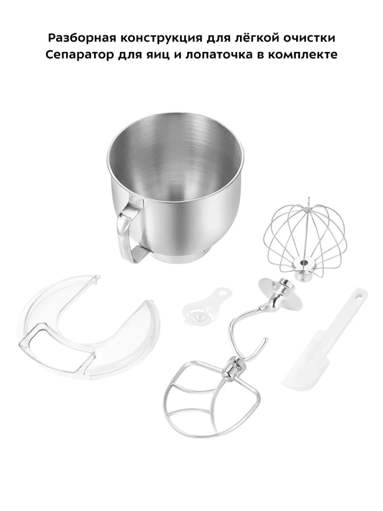В комплект входят венчик для взбивания, насадка для смешивания, крюк для замеса теста, сепаратор для яиц и лопатка для ручного смешивания. Эти аксессуары делают миксер многофункциональным и удобным в использовании.
