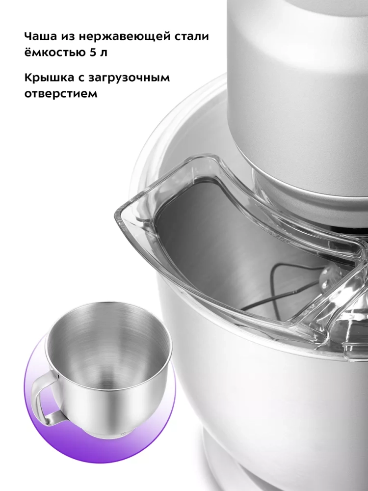 Стационарный миксер оснащен чашей объемом 5 литров, изготовленной из прочной нержавеющей стали, что позволяет смешивать даже горячие ингредиенты. Чаша надежно закрепляется на базе и комплектуется защитной крышкой с загрузочным отверстием, предотвращающей разбрызгивание. Через отверстие можно добавлять ингредиенты, не прерывая работу устройства.
