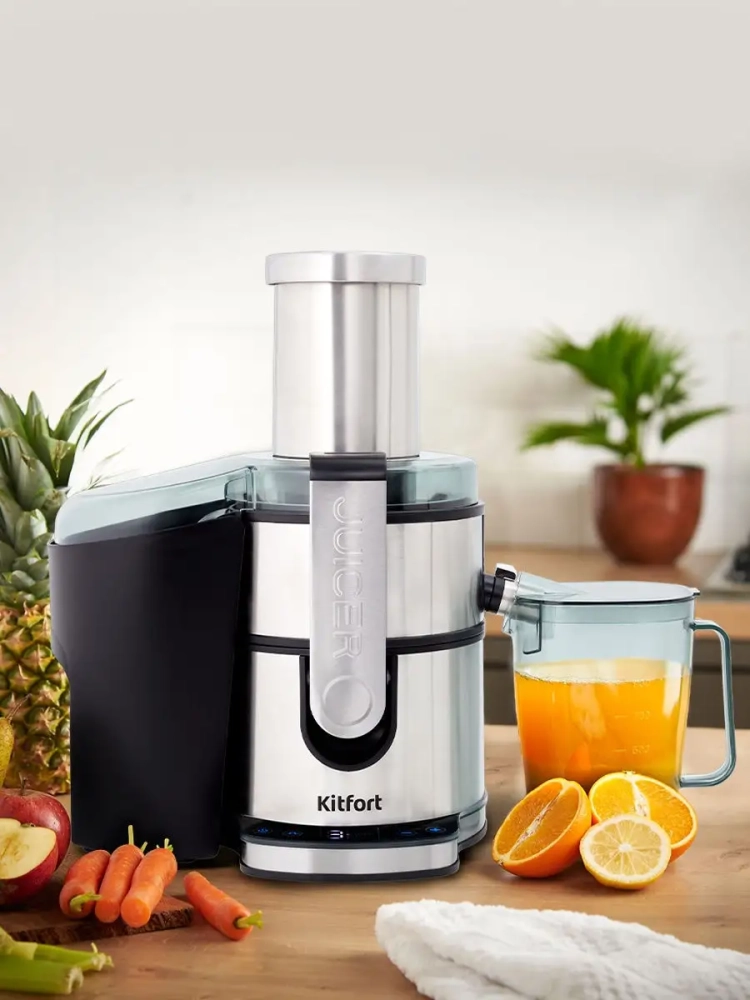 Центробежная соковыжималка Kitfort KT-1120 позволяет отжимать сок из фруктов, овощей и зелени с сохранением всех его полезных компонентов: витаминов, аминокислот и минералов. Соковыжималка Китфорт компактная, легко собирается и просто моется после работы.