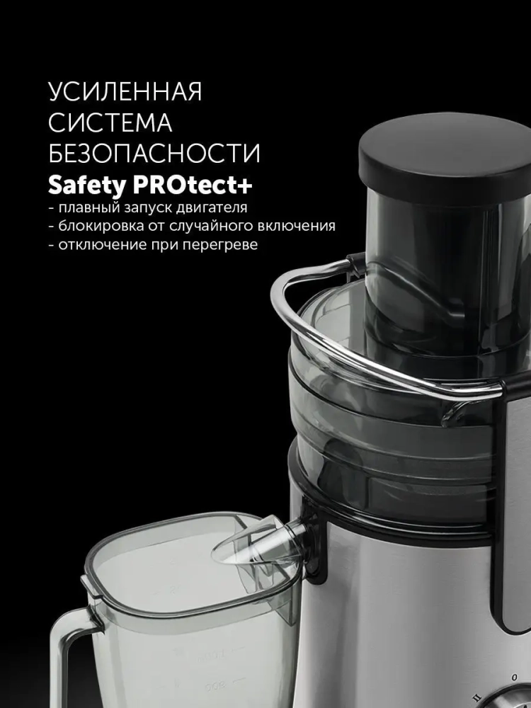 Широкий желоб для подачи целых фруктов и овощей: диаметр 85 мм. Отжим сока целых фруктов и овощей. Усиленная система безопасности Safety PROtect+: плавный запуск двигателя; блокировка от случайного включения; отключение при перегреве. Увеличенная рабочая площадь фильтра: на 50% больше сока. Низкий уровень шума. Автоматический выброс мякоти. Автоматическая блокировка при неправильно установленной крышке. Автоматическая защита двигателя от перегрузки. Легкость в применении и мытье.
