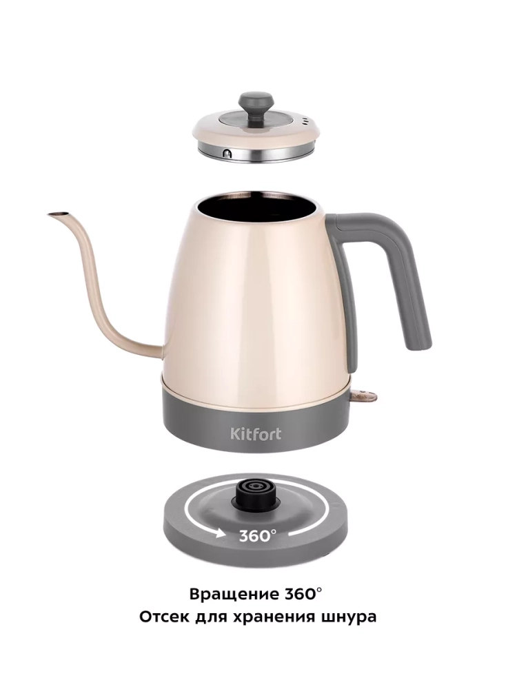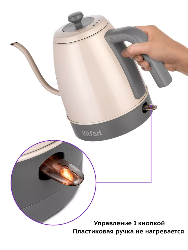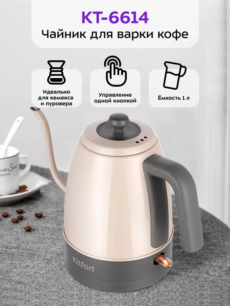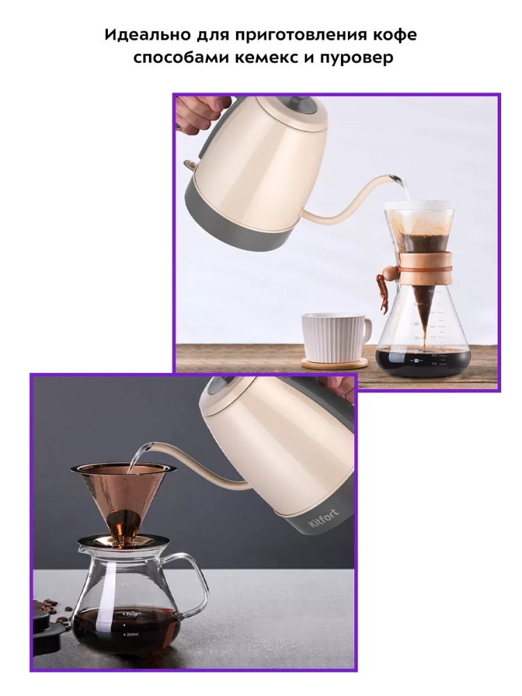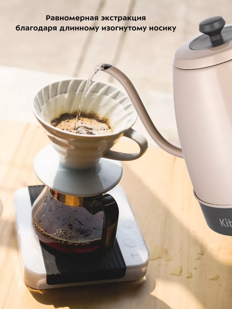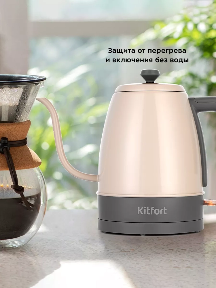 Электрический чайник Kitfort КТ-6614 предназначен для кипячения воды и приготовления кофе способами кемекс и пуровер.