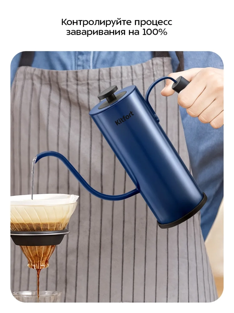 Длинный изогнутый носик чайника формирует тонкий и ровный поток воды, что является обязательным условием для приготовления кофе в кемексе или пуровере. Благодаря тонкому носику вы сможете постепенно и аккуратно добавлять воду в кофе, добиваясь равномерной экстракции. Контролировать пролив воды с помощью обычного чайника неудобно, так как широкий носик не позволяет добиться точно направленной струи воды с определенной скоростью, и в результате вкус и аромат кофе раскрывается не полностью.