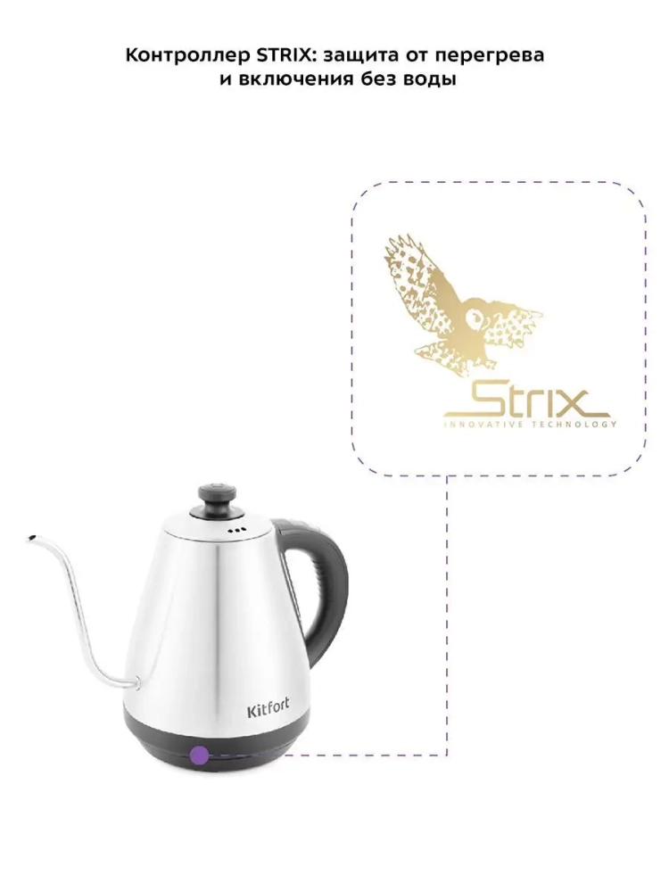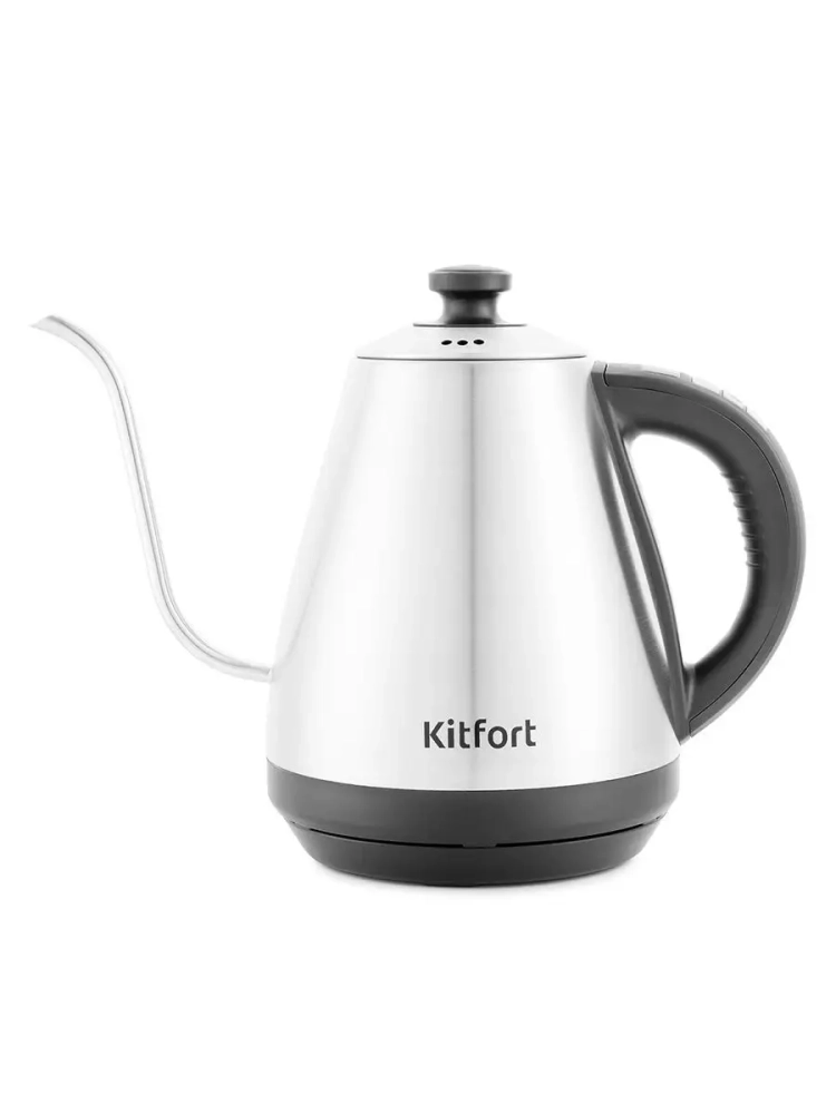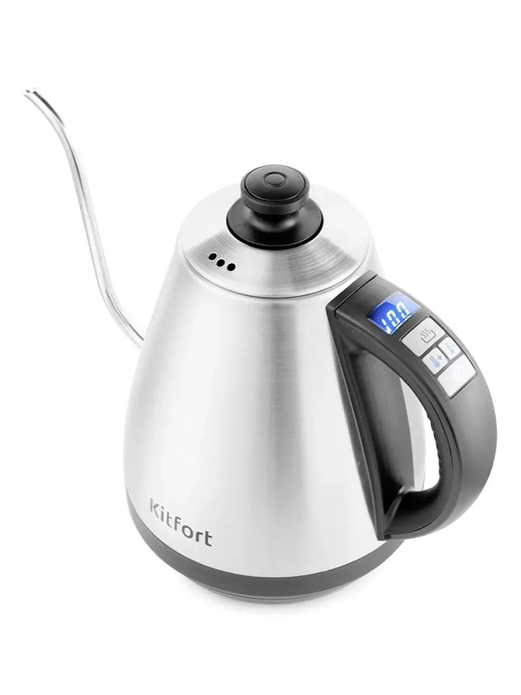 Электрический чайник Kitfort КТ-689 предназначен для нагрева и кипячения воды и приготовления кофе способами кемекс или пуровер. Мощность чайника позволяет использовать его в домах со слабой проводкой. Чайник оснащен терморегулятором и может не только вскипятить воду, но и нагреть ее до температуры от 40 до 100 °С, что очень удобно при заваривании различных сортов чая, приготовлении кофе и подогреве детского питания. Чайник также оснащен функцией поддержания температуры. Температура воды контролируется термодатчиком, встроенным в дно чайника.
