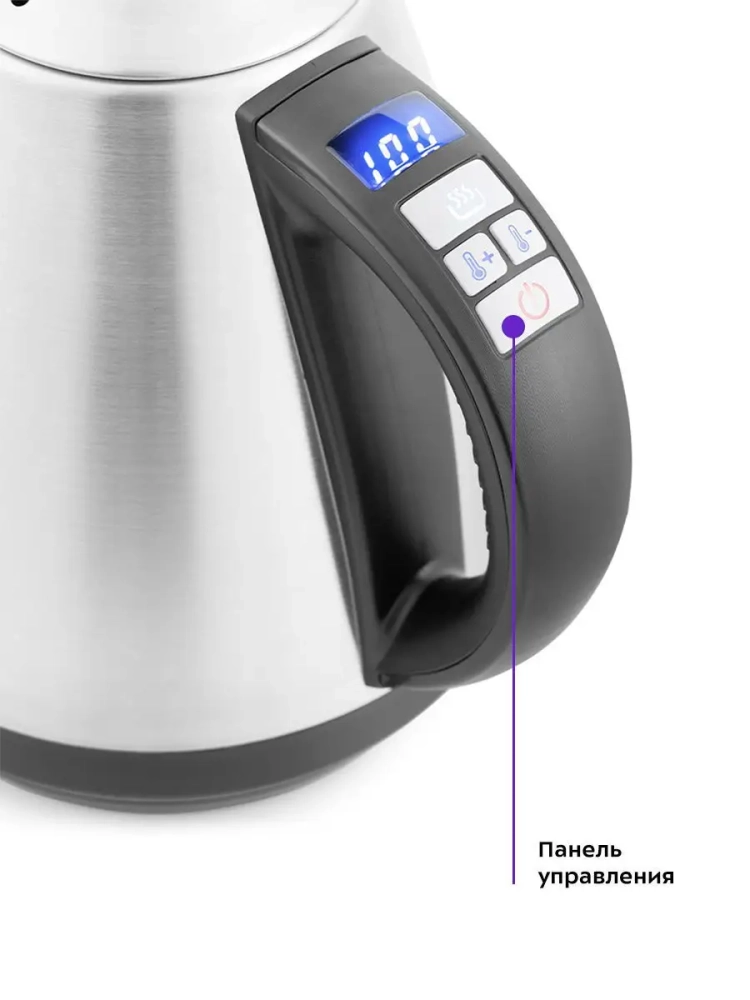 Ручка чайника пластиковая. Она не нагревается и удобно лежит в руке. На ручке расположена панель управления чайником и LED дисплей.