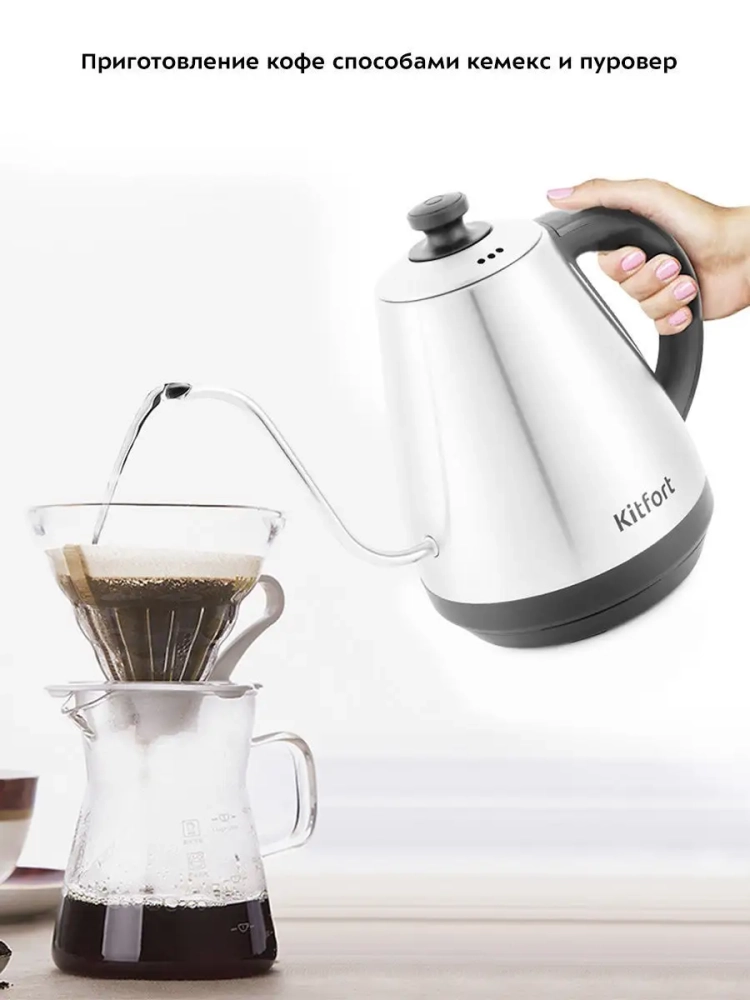 Длинный изогнутый носик чайника формирует тонкий и ровный поток воды, что является обязательным условием для приготовления кофе в кемексе или пуровере. Благодаря тонкому носику вы сможете постепенно и аккуратно добавлять воду в кофе, добиваясь равномерной экстракции. Мерная шкала находится внутри корпуса чайника.