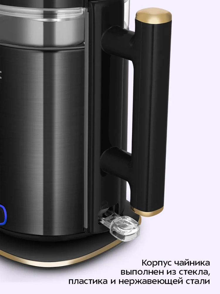 У чайника двойные стенки, благодаря чему вода будет дольше оставаться горячей. Также двойные стенки защищают от ожога, так как не сильно нагреваются. Внешняя часть чайника выполнена из нержавеющей стали. Внутренняя поверхность чайника состоит из стекла и нержавеющей стали. Крышка выполнена внутри из нержавеющей стали, а снаружи — из пластика. Подставка чайника пластиковая. Минимальная и максимальная отметки уровня воды нанесены на внутреннюю часть чайника. Ручка чайника пластиковая, не нагревается и удобно лежит в руке.