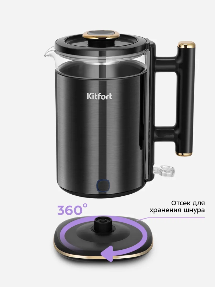 Подставка с центральным контактом дает возможность располагать на ней чайник в любом положении, обеспечивая вращение на 360°.