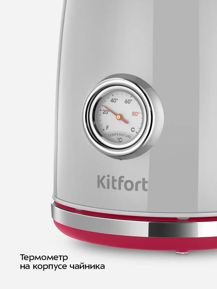 На корпусе чайника установлен термометр, который показывает температуру воды в чайнике. Это удобно, если вы готовите напитки, для которых требуется определенная температура воды, например, зеленый чай, белый чай, кофе и т.д. Принцип работы термометра термомеханический: биметаллическая пластина при изменении температуры деформируется и приводит в движение стрелку термометра. Для корректной работы термометра наполняйте чайник водой выше минимального уровня, чтобы щуп термометра полностью находился в воде.