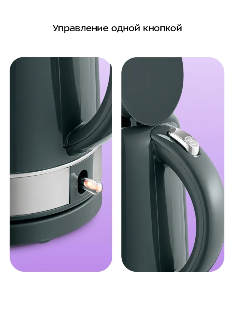 Кнопка открывания крышки расположена на ручке, а переключатель — под ручкой. При включении чайника загорается подсветка переключателя, которая является индикатором работы.