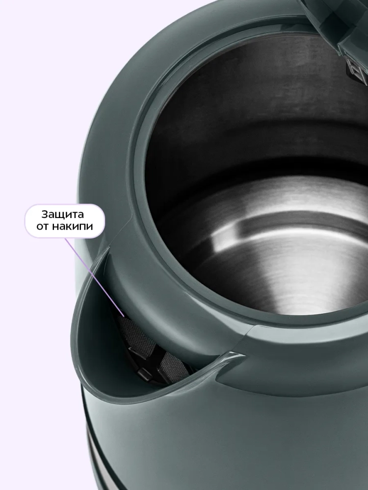 Чайник автоматически отключается при закипании, имеет защиту от перегрева и от включения без воды. В носике чайника расположен съемный фильтр от накипи.