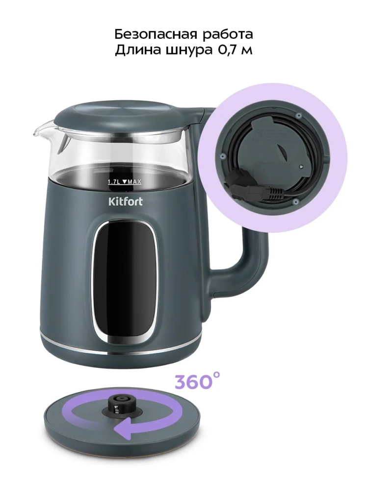 Подставка с центральным контактом дает возможность располагать на ней чайник в любом положении, обеспечивая вращение на 360°. Снизу имеется отсек для хранения шнура, в который можно смотать излишки шнура электропитания, чтобы он не мешал на столе.