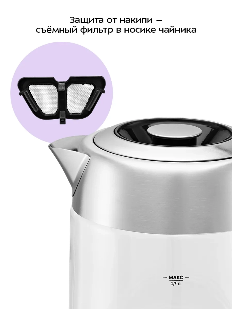 Полный чайник закипает примерно за 6 минут. Чайник автоматически отключается при закипании, имеет защиту от перегрева и от включения без воды. В носике чайника расположен съемный фильтр от накипи.