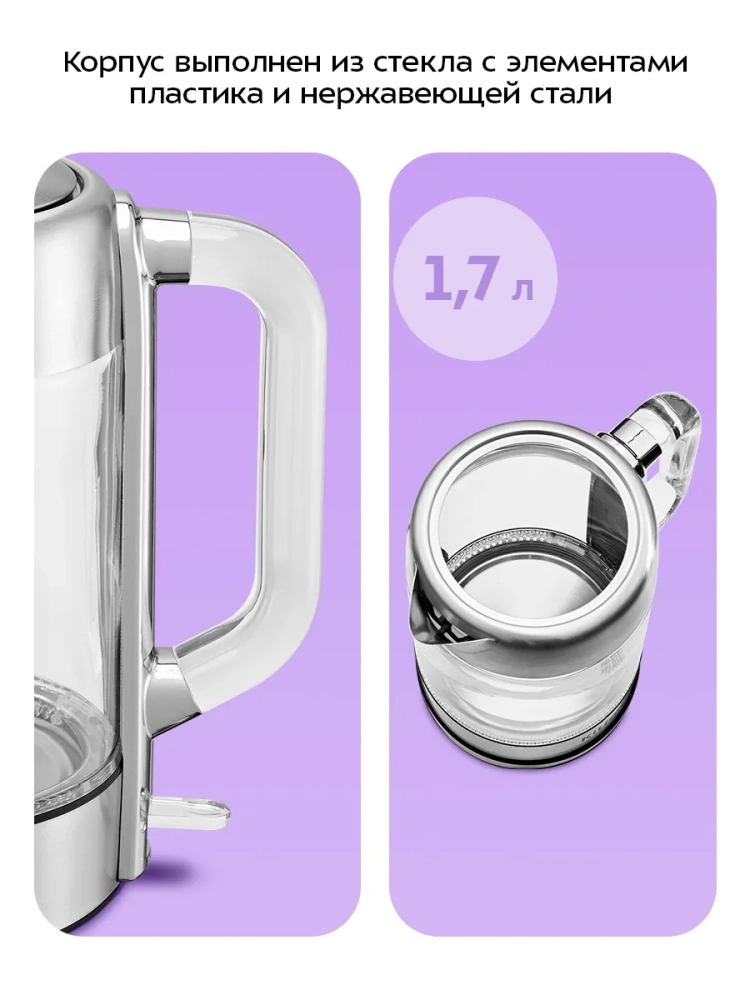 Корпус чайника выполнен из стекла с элементами пластика и нержавеющей стали, а крышка — из пластика и нержавеющей стали. Мерная шкала нанесена на стеклянную часть корпуса. Ручка чайника выполнена из прозрачного пластика, она не нагревается и удобно лежит в руке.