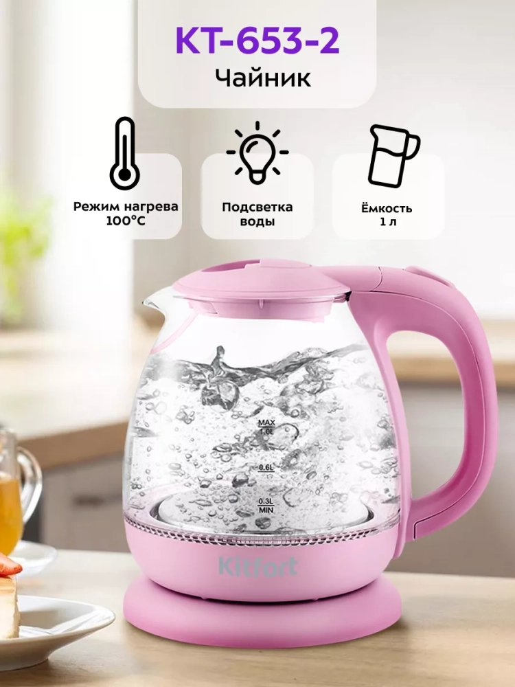 Электрический чайник Kitfort КТ-653 предназначен для кипячения воды дома, в офисе, на даче. Мощность чайника позволяет использовать его в домах со слабой проводкой.