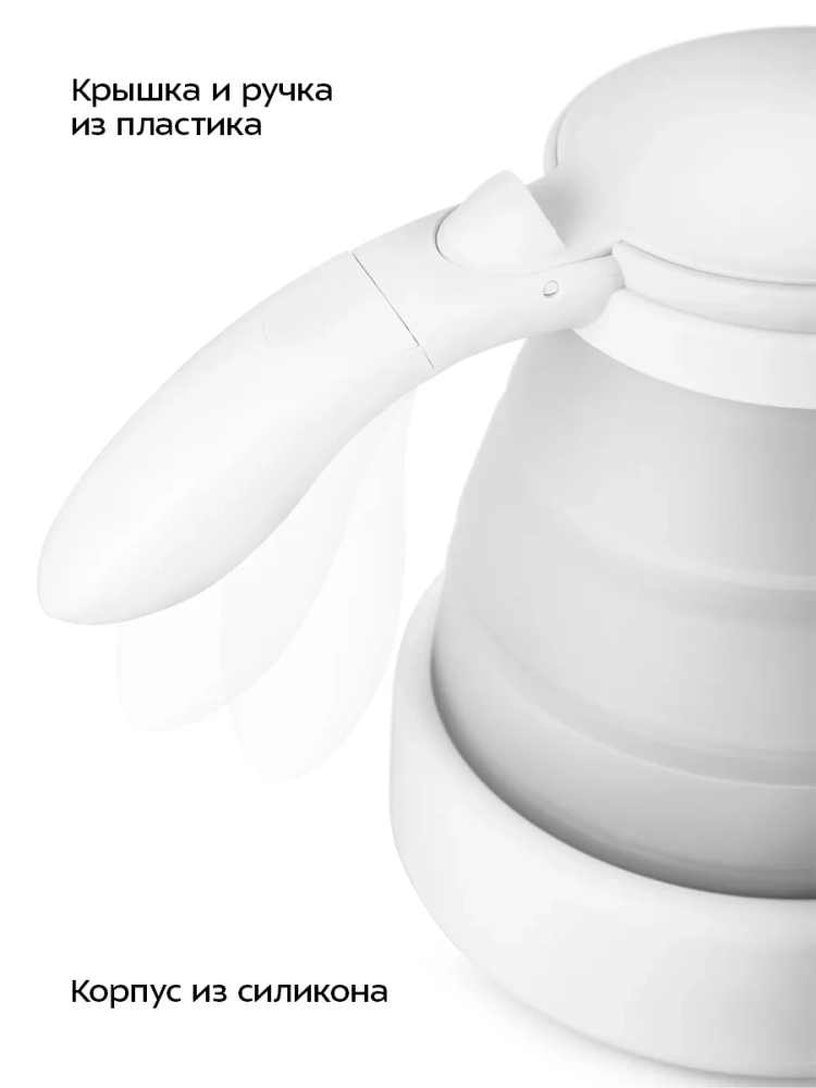 Корпус чайника выполнен из силикона, крышка и нижняя часть корпуса выполнены из пластика. Мерная шкала находится на боковой поверхности чайника. Ручка чайника пластиковая, не нагревается и удобно лежит в руке, для удобства хранения и перевозки ручку можно сложить.