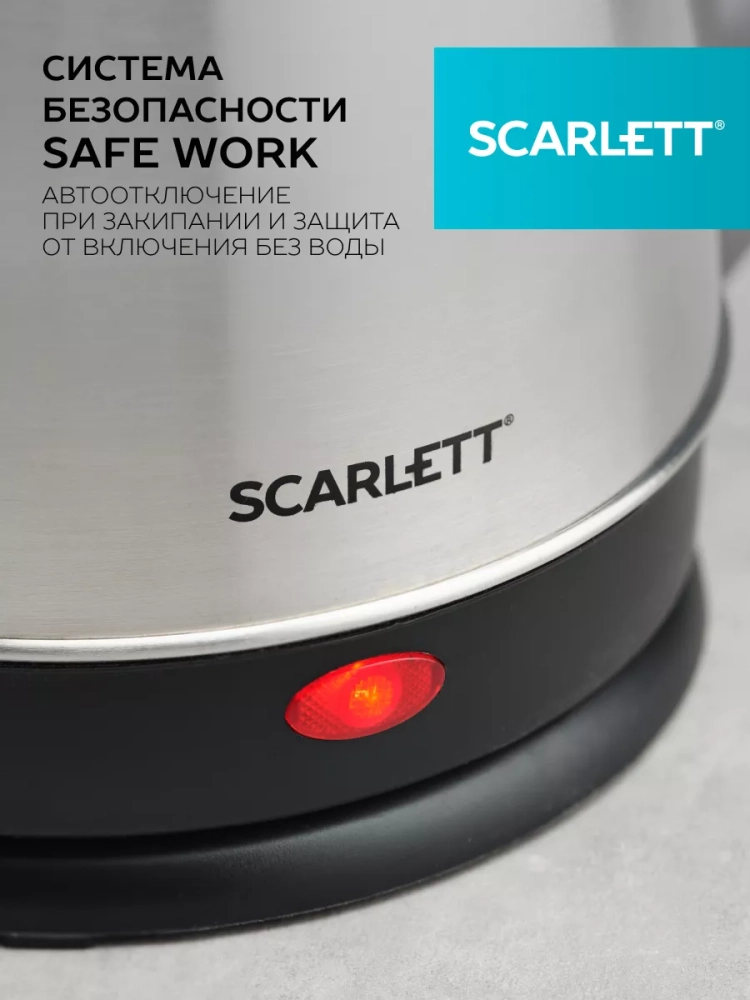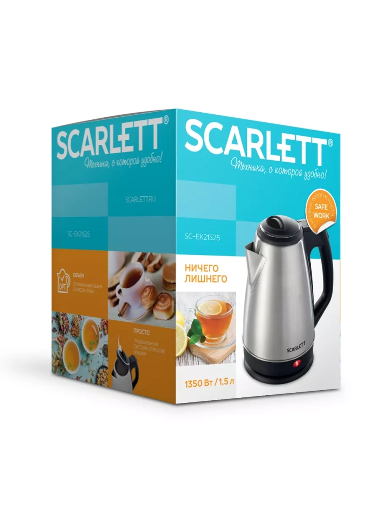 Электрический чайник SC-EK21S25 прост и интуитивно понятен в эксплуатации - традиционная система открытия крышки, удобная ручка, закрытый нагревательный элемент и световой индикатор работы. Система многоуровневой защиты позаботится о безопасности: автоматическое отключение при закипании, отключение при недостаточном количестве воды. Оптимальный объём 1,5 л, запас прочности на 5000 включений. Корпус из нержавеющей стали сделает прибор не только надёжным и долговечным, но и поможет легко вписаться в любой интерьер.