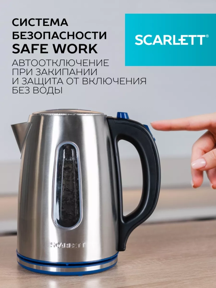 Электрический чайник SC-EK21S72 с увеличенным объемом 1.8 л оснащён автоматической системой открытия крышки. Элегантная, эргономичная ручка, нейлоновый фильтр, закрытый нагревательный элемент, сделают эксплуатацию прибора еще проще и комфортнее. Внутренняя подсветка позволит наблюдать за завораживающим процессом кипячения воды. Safe Work – автоотключение при закипании, защита от включения без воды сделают эксплуатацию прибора наиболее безопасной. Классическое сочетание цветов станет удачным решением на кухне!