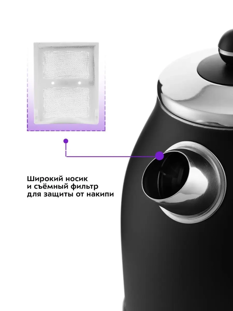 В носике чайника расположен съемный фильтр от накипи, выполненный из металла, который задерживает частички накипи и предотвращает попадание их в чашку.