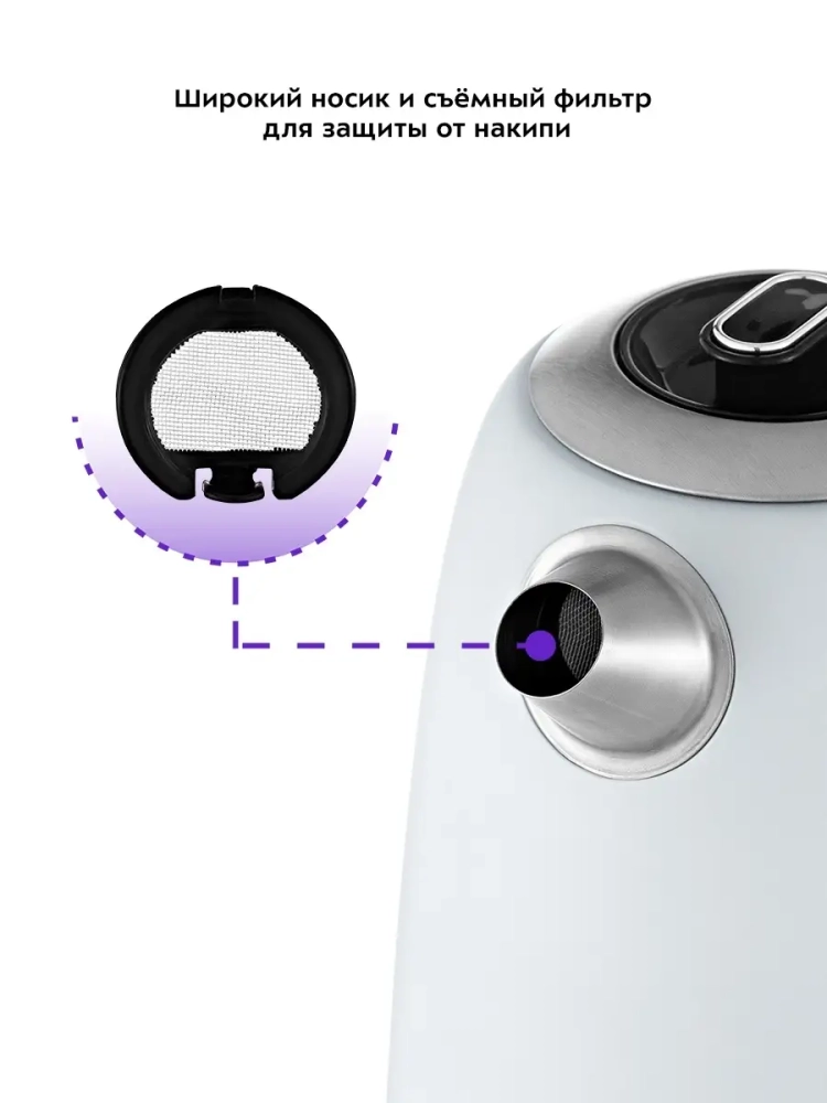 Нагревательный элемент (ТЭН) у этой модели чайника скрытый и находится в донной части. Сверху он закрыт специальной металлической пластиной из нержавеющей стали, благодаря которой исключается прямой контакт ТЭНа с водой. Такая конструкция препятствует образованию накипи, облегчает уход и значительно снижает шум при нагревании воды.
