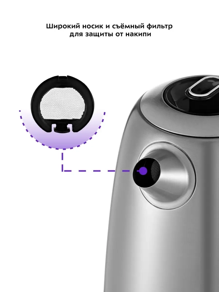 Нагревательный элемент (ТЭН) у этой модели чайника скрытый и находится в донной части. Сверху он закрыт специальной металлической пластиной из нержавеющей стали, благодаря которой исключается прямой контакт ТЭНа с водой. Такая конструкция препятствует образованию накипи, облегчает уход и значительно снижает шум при нагревании воды.
