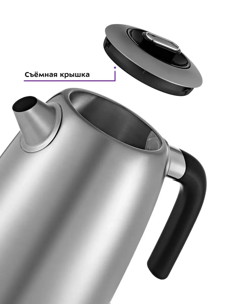 Корпус чайника и крышка выполнены из нержавеющей стали, а подставка из пластика.
